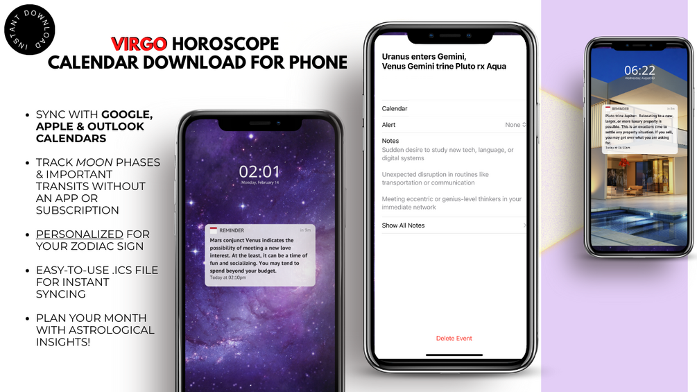 • Personalized for Virgo: Includes astrology events and moon phases specific to your zodiac sign, helping you stay on top of key dates and influences.